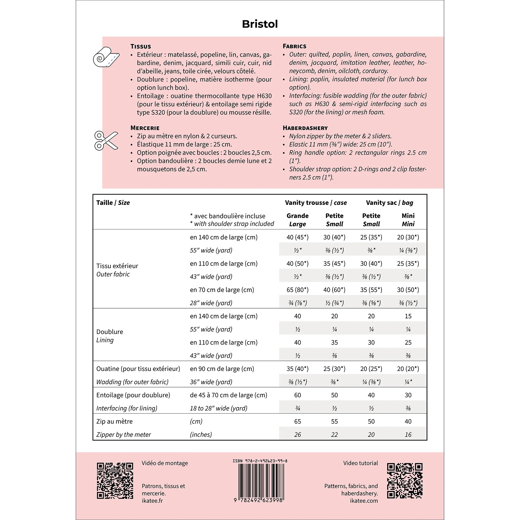 Tweetalige handleiding (Frans/Engels), patroonblad in meerdere maten zonder overlappende patroondelen en naadtoeslagen inbegrepen.