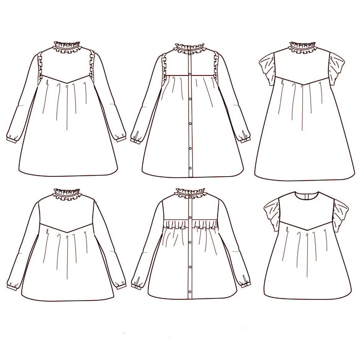 Je kunt kiezen uit lange mouwen met manchetten en een split of korte, uitlopende vlindermouwen. Het model heeft een opening middenachter en kleine ruches bij de armsgaten. Optioneel kun je ook de achterkant voorzien van extra ruches voor een speels effect.