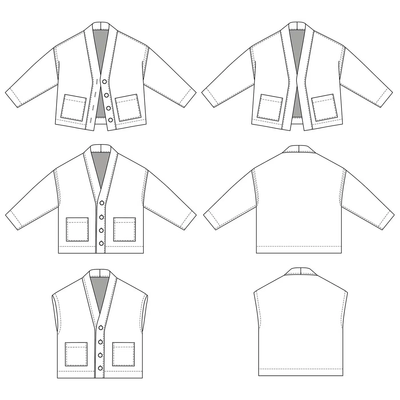 Macao is een naaipatroon voor een jasje of vest met een losse pasvorm en verlaagde schoudernaden. Het ontwerp biedt de keuze tussen lange mouwen of een mouwloze variant. De gevormde, gevoerde halsboord geeft het kledingstuk extra structuur en een verzorgde uitstraling. Dankzij de platgestikte naden (flat-felled seams) heeft het jasje of vest een sterke, duurzame en professionele afwerking.