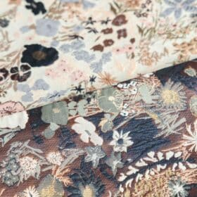 Jacquard is een stof met een ingeweven patronen. Dit betekent dat tijdens het weven de patronen al in de stof worden gecreëerd. Jacquard is perfect voor kimono's, jasjes en gilets. Zoals je kan zien heeft de stof twee verschillende kanten. Let wel op dat de stof zeer dun is. Wil je meer volume? Watteer je project met fiberfill en een effen voering.