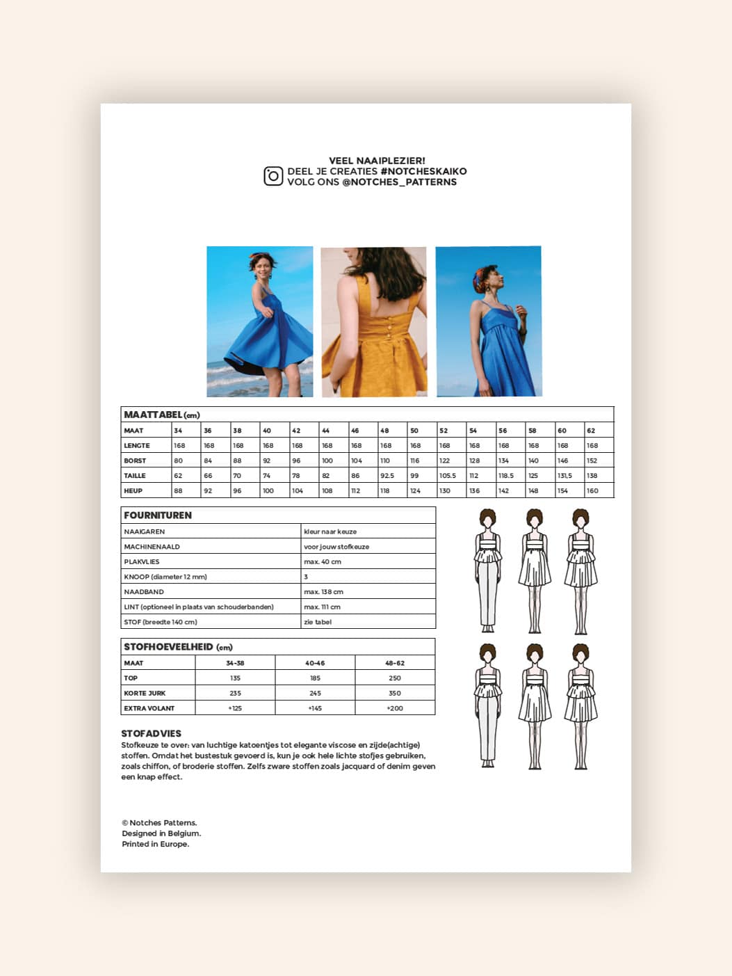 Van zonovergoten stranddagen tot cocktailavonden, van peplum top tot chique jurk, of hip te dragen over een T-shirt, Kaiko is dé must-have voor de zomer én tussenseizoen. Voor de lengte kan je kiezen uit twee opties: een korte top of een jurk net boven de knie. Het rokdeel waaiert wijd uit. Combineer beide rokdelen en maak er een zwierige laagjesjurk van! De knopensluiting op de rug zorgt voor een mooi aanpassende snit. Je kan brede schouderbandjes maken die op vorm getekend zijn voor een mooie pasvorm, of kan je opteren voor smallere voorgemaakte linten. En het best van al is: het gevoerde borststuk komt in verschillende cupmaten en het patroon gaat tot maat 62!