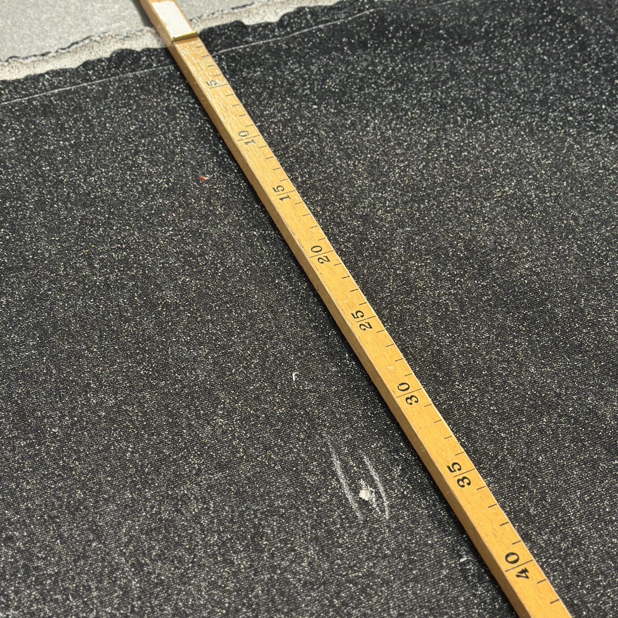 Er zit een gaatje in de stof ter hoogte van 65 cm en op 35 cm vanaf de zelfkant gemeten. Zie foto. 65 cm is dus sowieso bruikbaar van de stof en daarna om het gaatje heen te werken :-)